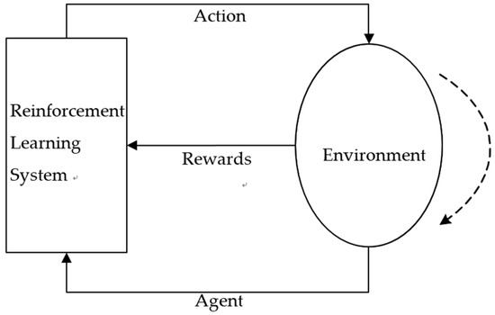 As an important branch of machine learning, reinforcement learning (RL) [24] interacts with the environment actively and constantly, updates iterations based on feedback, and finally gives the optimal strategy. It contains the main elements of agent, state, action, and rewards, and its learning target is to obtain the optimal strategy to maximize the long-term cumulative rewards. As shown in Figure 1, the most important feature of reinforcement learning is the capability of autonomous and online learning without any prior knowledge and state transition probability. Firstly, the agent perceives the state of the environment and takes various exploratory actions according to the accumulative compensation. After taking the action, the environment undergoes a state transition and enters into a new state. At the same time, the behavior strategy is evaluated, and the feedback is returned to the learning system. After receiving the feedback of the reward or the punishment, the agent modifies its strategies continuously to meet the requirements of the environment, and the whole process is iteratively updated until the optimal strategy is obtained.
