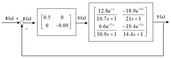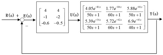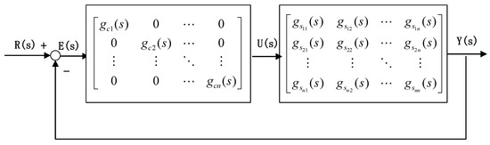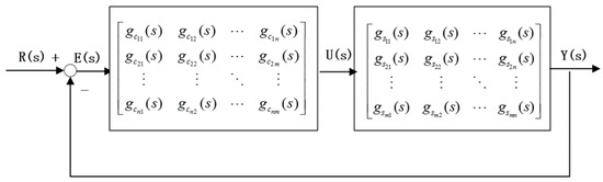 A multivariable square closed-loop control system n × n is depicted in Figure 3, where G s ( s ) is the controlled object, G c ( s ) is the distributed diagonal controller, R is the system input vector, Y is the system output vector, E is the deviation vector, and U is the controller output vector.