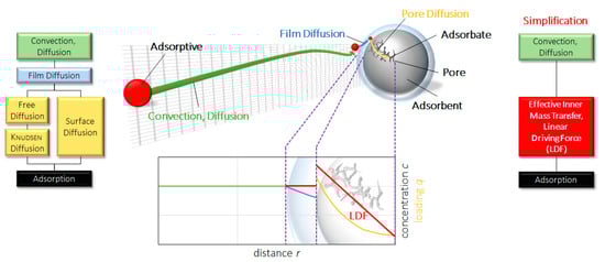 - A mass balance equation within the particle, depicted by LDF approximation expressed by Equation (2).