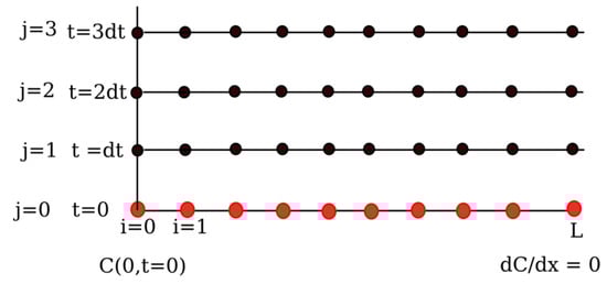 To numerically solve the problem, the method of lines (MOL) was adopted and then implemented. The filter bed was considered as a one-dimensional object and discretized in space through the finite difference (FD) method, as follows (red dots in Figure 1):