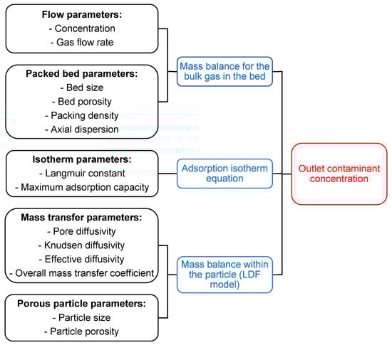 In the proposed adsorption model, the most influential parameters can be divided into parameters calculated by empirical correlations (overall mass transfer and axial dispersion coefficient) and operating parameters (initial concentration, bed length, gas velocity and void fraction). A sensitivity analysis was performed varying these parameters. Their effect on the dynamic adsorption behavior was studied.