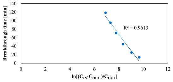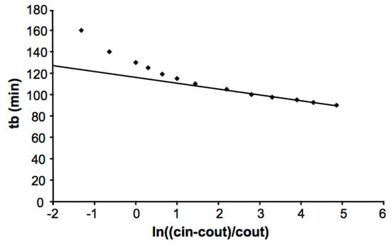 The first one is based on one single breakthrough curve and foresees a plot of tb against ln[(Cin − Cout)/Cout]. The result should be a straight line for high values of ln[(Cin − Cout)/Cout], as shown in Figure 4 [34]. Furthermore, this graph could be useful to extract We and kV, which are linked respectively to the intercept with the y-axis and to the slope of the line. However, this procedure presents several drawbacks, such as the high uncertainty of the calculated We and kV, or the fact that is it not specified how the point must be considered for the fitting. Another validation method consists of performing several experiments with different amounts of activated carbon simply by changing the length-to-diameter ratio (L/D). Plotting breakthrough times against the bed weight should yield a straight line, through which it is possible once again to extrapolate We and kV from the slope and intercept. However, the final test to prove unambiguously the applicability of the Wheeler–Jonas equation is to try using it in a predictive role by exploiting a limited number of experimental tests to evaluate We and kV: the equation should be able to predict breakthrough times for different amounts of carbon, inlet concentrations and flow rates. Therefore, if used in the right way, the Wheeler–Jonas equation can be considered a powerful tool to describe any type of single vapor adsorption on a suitable adsorbent. Moreover, the scope of the Wheeler–Jonas equation may even be extended to co-adsorption, as already demonstrated by its ability to predict organic vapors’ breakthrough times under humid conditions [36]. The validation of both proposed models will be accomplished.