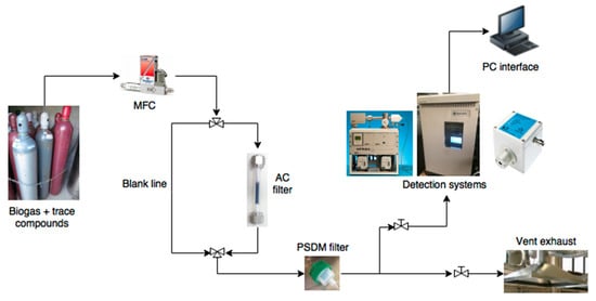 The experimental test rig layout is reported in Figure 5. Mass flow controllers (Bronkhorst High-Tech B.V., Ruurlo, The Netherlands) were adopted with an exploitable range from 100 to 200 Nml/min. The simulated biogas mixture with pollutants is regulated with three electronic mass flow controllers to feed a carbon cartridge; a blank line was also built using a three-way valve. This blank condition represents the biogas mixture with pollutants that need to be removed from the filter. Single-filter bed configuration is tested using the different commercial sorbents described above.