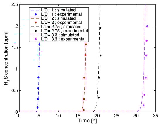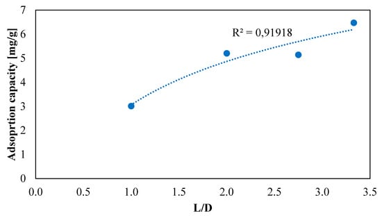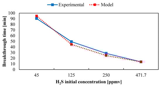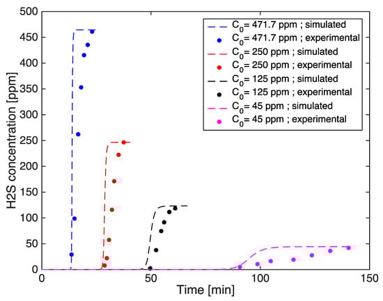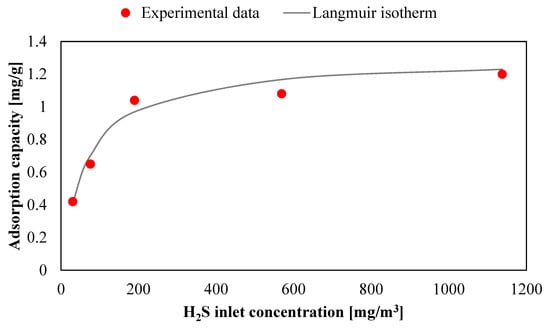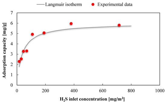 In the second testing campaign, the research was focused on the influence of pollutants’ concentration on the adsorption capacity (H2S range from 10.5 ppm(v) to 471.7 ppm(v)). The fixed parameters were the gas velocity (0.32 m/s), aspect ratio (L/D = 10) and temperature (30 °C).