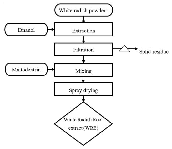 Figure 1 illustrated the preparation process of WRE. The root powder was extracted via solvent extraction method with ethanol 70% (v/v), ratio of substrate and ethanol: 1/20 g/mL for 4 h at 60 °C. After extraction, the mixture was filtered thrice through Whatman No.1 paper. The filtrate was evaporated under vacuum to a constant weight to obtain a crude, flavonoid-rich paste. Prior to spray drying, this crude paste was mixed with maltodextrin 4% (based on the dry matter). To obtain white radish root extract (WRE) with a moisture of lower than 6.0% (w/w), the temperature for spray drying was maintained at 160 °C. Finally, WRE were packed tightly in a thermoplastic low-density polyethylene bag and avoid direct light until further use.