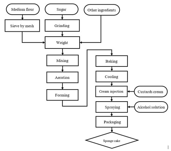 The sponge cake formula was produced by a standard all-in procedure, as illustrated in Figure 2 [18]. All ingredients were mixed in a mixer (Kenwood KM250, Kenwood Ltd., Woking, UK). For the control sample, 1300 ppm of potassium sorbate was added. For the testing sample, this preservative was replaced by 30 mg/mL of WRE. After mixing, the dough was transferred to aeration machine to create a foam structured dough. The specific gravity of the obtained dough was approximately 0.47–0.49 and the temperature was around 28–30 °C. Prior to baking, the dough was transferred into tanks and was pumped into molds through forming nozzles. An automatic oven (Dong Yang Dynamics) with baking functionality was employed with setting profiles: 170 °C for 16 min for oven zone 1, 190 °C for 5 min for oven zone 2; 220 °C for 3 min for oven zone 3, 1 min for damper, total baking time of 23 min. The cake after cooling is injected with a custard cream with a weight of 8.0–8.5 g/piece. To preserve the product, each cake was sprayed with 0.3 ± 0.05 mg of alcohol solution 30% (v/v) onto their surfaces. Finally, the products were packed under tight conditions and prevented from exposure to air.