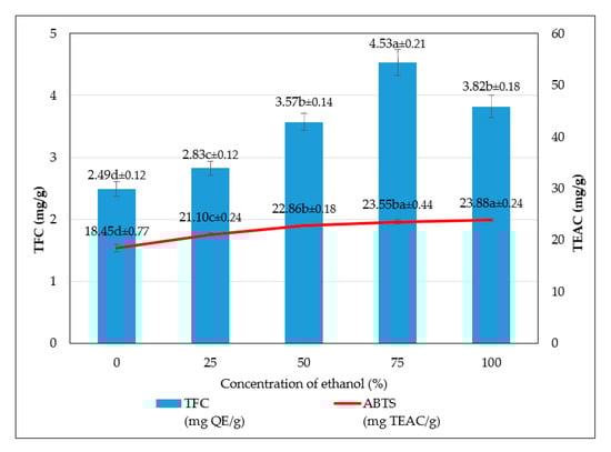 The effect of ethanol concentration on the total flavonoid content (TFC) and Trolox equivalent antioxidant capacity (TEAC) on WRE.