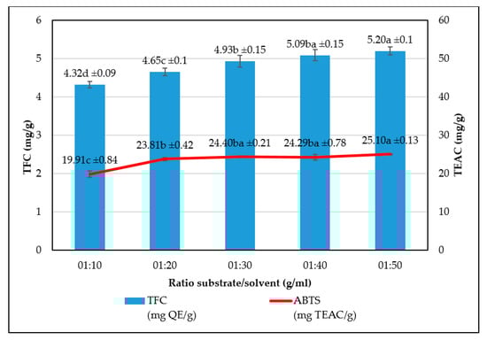 In the results of the next experiment (Figure 4), conducted at ethanol concentration 75%, it was found that at the material/solvent ratio of 1:50, the TEAC and TFC peaked at 25.1 and 5.2 mg/g, respectively. However, closer examinations of test statistics and the data revealed that these peak figures were statistically indifferent to those observed at the ratio of 1:30. In addition, the process performed at the high material/solvent ratio showed no economic advantages. The explanation for the relationship could be three-fold. First, the phenomenon could be due to the enlarged contact area between the materials and the extraction solvent, leading to increased extraction efficiency. Second, the gradient in concentration between solid and the solvent might have accelerated the mass transfer, improving the flavonoid yield [26]. Third, the material/solvent ratio could alter the equilibrium constant of the reaction and the recovery efficiency, however only to a certain threshold where the rate of yield starts to diminish with increasing ratio [27].