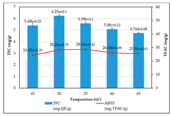 The effect of temperature on the flavonoid yield and antioxidant activity of the WRE was described in the Figure 5. Experiments were performed at ethanol concentration of 75% and material/solvent ratio of 1:30. As the temperature rose from 45 to 50 °C, both TEAC and TFC witnessed a sharp rise to highest levels, at 28.26 and 6.25 mg/g, respectively. Afterwards, elevating the temperature seemed to gradually reduce both indicators. Since the high temperature could reduce viscosity of the solution, physical processes that involve diffusive and convective transport of nutrients could be facilitated. Furthermore, elevated temperature of the solution may play an important part in breaking down plant cell walls and linkages inside the material such as protein–phenol or phenol–polysaccharide links. Both explanations lead to increased TEAC and flavonoid content. However, excessively high temperature could adversely affect the flavonoid and other nutrients through decomposition or combination with others component, partially contributing to their change in oxidation properties.