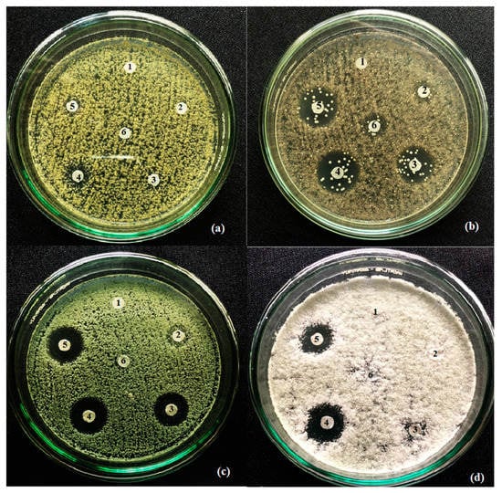 Antifungal susceptibility testing against (a) Aspergillus flavus NBRC 33021; (b) Aspergillus niger NBRC 4066; (c) Aspergillus clavatus NBRC 33020; (d) Fusarium solani NBRC 31094; (1): Negative control—DMSO 5%; (2): WRE 25 mg/mL; (3): WRE 50 mg/mL; (4): WRE concentrate 75 mg/mL; (5): WRE 100 mg/mL; (6): Positive control—natamycin 0.2 mg/mL.