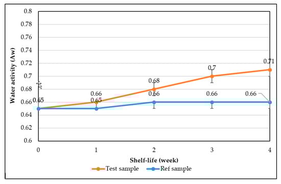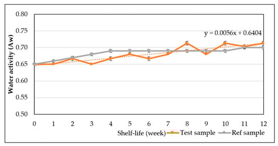 Figure 12 shows the range of water activity of sponge cake at different storage periods. Overall, water activity ranged from 0.65 to 0.71, demonstrating that sponge cake added with WRE can inhibit the activity of most bacteria and yeasts. In this temperature condition, one additional week of storage rises the water activity of the sponge cake by approximately 0.016.