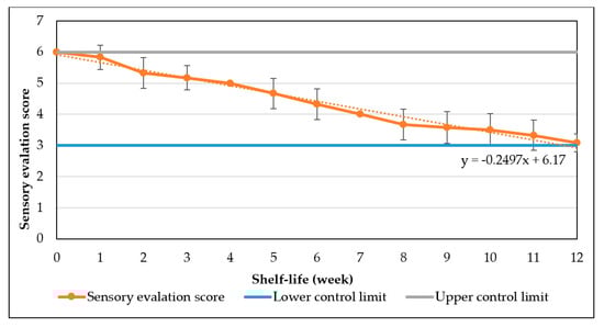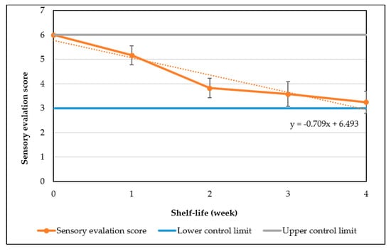 Under 37 °C, it was indicated that the sensory score fell rapidly and approximated the lower control limit of 3.00 for cake samples after 4 weeks of storage (Figure 13). This number is lower in comparison with the previous sensory results where the lower limit was reached at cake samples stored after 12 weeks. After four weeks, SE score was 3.25 ± 0.45 (>3, lower control limit), suggesting acceptable quality of the cake.