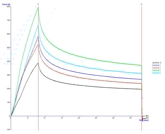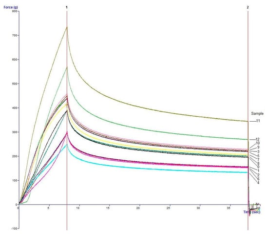 Firmness of sponge cakes after various storage times are visualized on Figure 11 and in Table 4. Maximum firmness of sponge cake was reached at the 11th week (732.08 ± 3.37). In cakes after 12 weeks of storage, the texture was slightly softer (578.15 ± 0.07). In comparison with the standard sample (sponge cake stored at 5 °C), the surface of the cake was drier. The explanation could be due to the natural starch degradation occurring in the sample. For this reason, it was suggested that application of WRE 30 mg/mL did not improve texture of sponge cake.