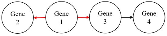 Cai et al. [3] developed a random walk-based technique to cluster similar genes. The authors show that the proposed method was useful in strengthening the interaction between genes by considering the types of interactions that exist in the same group of genes. Many previous random walk-based methods managed to extract local information from a large graph without knowledge of the whole graph data [4]. In a random walk-based method, a gene is important if it interacts with many other genes [5,6,7,8]. As illustrated in Figure 1, gene 1 has a higher degree than gene 2 (two outgoing links) compared to one outgoing link from gene 3 to gene 4. In this case, gene 1 is the most important gene among the four genes shown in the hypothetical gene network.
