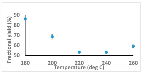 Effect of temperature on the yield of hydrochar from manure (fractional yield vs. temperature).