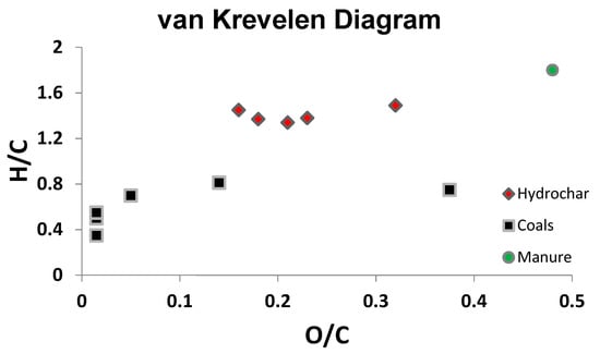 Beyond how these hydrochars compare to each other, it is important to determine how they compare to the feedstock and fossil fuel coals. This comparison can be made using the van Krevelen diagram (Figure 2), a common means of comparison for coals, which charts atomic ratios of hydrogen and oxygen to carbon as described by []. The highest rank coals are plotted in the bottom left corner of the diagram and have the lowest H/C and O/C ratios. Carbonization enhances biomass for consumption as a solid fuel by removing hydrogen and oxygen, causing densification of carbon. Before HTC, dried manure had oxygen and hydrogen content higher than low-rank brown coal. After HTC, hydrochar oxygen and hydrogen contents were reduced. Swine manure hydrochar had an O/C ratio between low bituminous coal and brown coal, but a higher H/C ratio than coal. A similar trend was also reported by [] for the HTC of swine manure, where increased temperatures from 180 to 300 °C decreased the H/C ratios from 1.18 to 0.91. Similarly, based on the data presented by [], the H/C ratios were found to decrease from 1.75 to 1.42 when the temperature was increased from 140 to 220 °C. Recently, the authors of [] observed that while H/C ratios generally decreased (1.75 to 1.29) with an increase in temperature, the addition of CaO appeared to increase the H/C ratio due to carbon decomposition, although increased CaO concentration decreased the H/C ratio. These results suggest that HTC results in the densification of carbon while simultaneously decreasing the oxygen and hydrogen from the hydrochar.
