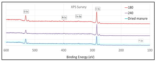 Representative X-ray photoelectron spectroscopy (XPS) plots of hydrochars and dried manure (×103 CPS vs. Binding Energy).