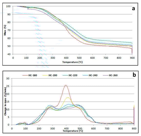 The TG curves show similar decomposition for each char, except for HC-180. The TG curve associated with 260 °C (HC-260) ran nearly parallel to the other profiles, although it was lower during the beginning stages of weight loss due to more mass loss at the dehydration stage (~110 °C) due to the presence of the highest moisture content. Conversely, HC-200 mass was consistently higher than the rest, which was likely due to it having the highest residual ash, meaning less of that char decomposed due to it having a higher proportion of ash, but was otherwise similar to the rest. HC-180, however, showed a different trend and maintained a higher percentage of its original mass than the others initially, before a rapid drop off leading to HC-180 having the least mass retained in the sample. The difference in HC-180 from the others is highlighted further in the DTG, Figure 5b, where it had the largest peak by far, indicating that much of the mass was lost at a higher rate over a smaller temperature range than the others.
