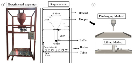 (a) Experimental apparatus and schematic of the measurement of pellet pile and (b) the geometric models of different packing method in simulation.