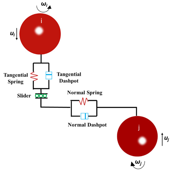 The simulation part of this research is based on DEM, which was firstly proposed by Cundall and Strack [26]. This method considers two types of motion of a particle, translation and rotation, which are governed by Newton’s second law of motion. The elastic contact force expression used in this work is the non-linear Hertz-Mindlin no-slip model [27], which is illustrated in Figure 2. The basic expressions are given in Equations (2) and (3). The former is the translational equation, which is composed of gravitational force, mig, contact force and viscous contact damping force, where Kn, Kt, γn and γt express the normal elastic constant, tangential elastic constant, normal damping constant and tangential damping constant, respectively. A particle with the mass of mi contacts with K particles, and the contact force between them depends on the deformation between particles, δn. In the equation, ui, vn and vt represent the translational velocity, and the component of relatively velocity for the normal and tangential directions.