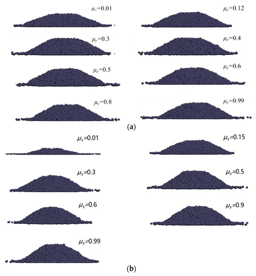 Vertical cross-sections of the pellet pile simulated under different (a) rolling and (b) static friction (b) coefficients.