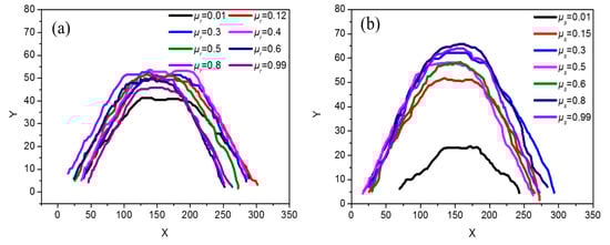 We first studied the influence of DEM parameters on the angle of repose of the pellet pile. As the effect of a physical parameter is studied, the other parameters were kept unchanged at the values reported in Table 2. From work reported in the literature [2], it is known that the angle of repose is sensitive mainly to the rolling and static friction coefficients between the particles. Vertical cross-sections of the pellet pile with different rolling and static friction coefficients are shown in Figure 3. It was observed that when the rolling and static friction coefficients increase from low (0.01) to high (0.99) values, the shape of the pile changed a lot, especially for the latter parameter. The results of contour extractions of the heap are shown in Figure 4. It is obvious that the height of the pile increases and then tends to be stable.
