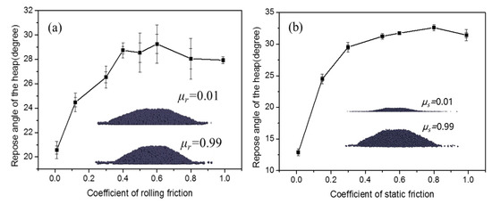 Figure 5 shows the angle of repose with different rolling and static friction coefficients, with error bars indicating the deviation of the angle of repose in different directions of the pile. The angle of repose shows a positive correlation with the friction coefficients. When the static and rolling friction coefficients change from 0.01 to 0.99, the angle of repose of the pellet pile changes about 8° and 20°, respectively, which indicates that static friction coefficient has a stronger impact on the angle of repose. In general, high static friction is always accompanied by high rolling friction, and the latter depends on the physical properties on the particle surface. However, there is a decreasing trend when or . A reason may be that the heap has reached the maximum stable angle at this point, and a further increase in the friction coefficient will cause the heap to collapse.
