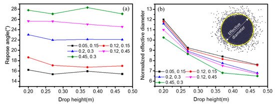 (a) Angle of repose and (b) and normalized effective diameter of the heap (top view) with different coefficient of static and rolling friction for different drop heights in the Discharging Method. (The numbers in the two figures represent rolling and static friction coefficients, respectively) The inserted subfigure in (b) is a top view of the simulated pile.