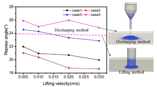 In the simulation of the Lifting Method, we designed four different cases (Table 3) to study the influence of the barrel size and lift speed on the angle of repose. Case 1 and Case 2 have the same coefficient of friction, but different barrel size. All the cases were considered with four different lifting velocities (0.005 m/s, 0.01 m/s, 0.02 m/s and 0.03 m/s). Figure 7 shows the angle of repose with different lifting velocities. The angle of repose tends to decrease when the lifting velocity increases, and this trend is weakened as the friction coefficient increases because a small lifting velocity makes it easier to keep the particles in their original positions. Through comparing Cases 1 and 2, it can be seen that the angle of repose will increase if the barrel size gets smaller. The dotted pink line and solid pink line in Figure 7 represent the angle of repose with different packing methods, but the same DEM parameters, which reveals that the angle of repose formed by the Lifting Method is larger than that determined by the Discharging Method.