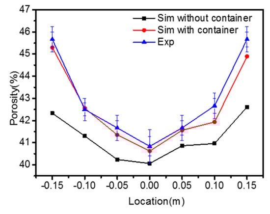 Comparisons of simulated (with and without containers) and experimental bottom porosity distribution (BPD) of the pellet pile.
