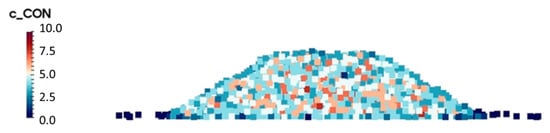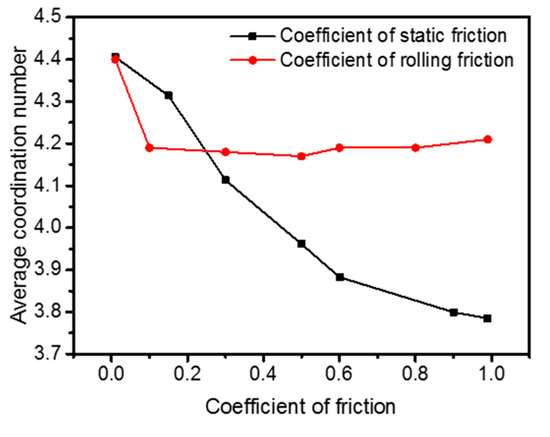Figure 12 depicts the frequency distribution of CN for different static and rolling friction coefficients, showing a maximum value of the frequency at CN ≈ 4. Thus, most particles are in contact with four neighboring particles. The static friction coefficient affects the frequency distribution, but mainly for , and the rolling friction seems to have no effect. As seen in Figure 13, when the static friction coefficient increases, the CN of the heap decreases, but the decrease is small for . The reason may be that if the CN is small, the porosity is large. The average CN of the heap is only affected by the rolling friction when the coefficient is very small.