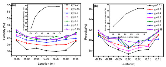 Figure 11 shows the BPD of the heap when the rolling and static friction coefficients change, where the inserted graphs show the average value of BPD. When the static and rolling friction coefficient change from 0.01 to 0.99, the average porosities change by 7 and 3 percent points, respectively, which means that the static friction coefficient has a greater impact on porosity. This conclusion is also supported by findings reported in the literature [3,6,30,31,32,33].