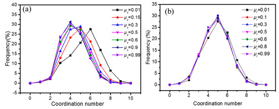 Frequency distribution of coordination number with different (a) static and (b) rolling friction coefficients.