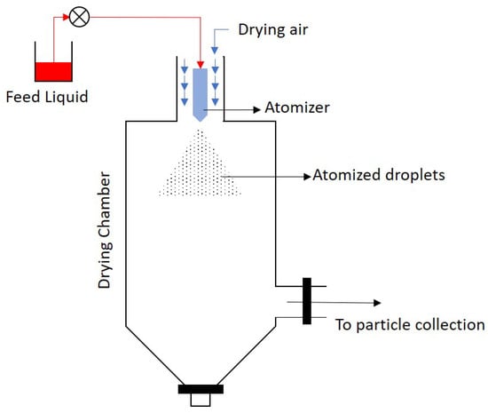 Spray drying is a widely-used unit operation in the production of high-value-added products in the food, fertilizers, chemical, and pharmaceutical industries [,,,]. Its application ranges from the production of milk and other diary products, to the very complex formulations of composite materials used in medicines, to biological products for which few other drying technologies are feasible. Spray drying is a cost-efficient, continuous, and relatively easy to operate process []. A typical spray dryer, as shown in Figure 1, consists of two sections, an atomization section and a drying section. The atomizer disperses the liquid mixture into small droplets, which then fall into the drying chamber. Small droplets dispersed in a hot gas medium offer large surface areas for mass and energy transfer, while guaranteeing short exposure of the product to high temperatures [,]. The dried product is then collected using an array of cyclones and filters. Spray drying allows a more specific functional design of products. It provides high flexibility on the input mixture because the liquid feed can be provided in various forms, e.g., solutions, emulsions, or suspensions. The nature of the particulate product ranges from pure substances, solid blends, to composite materials, and viable biological components. With proper tuning, spray drying offers relatively narrow particle size distributions in the range between nano- to micro-sized particles [,,], and good control over other particle properties like residual solvent content, morphology, and density. The major tuning parameters include the flow rate and temperature of the feed and drying gas; concentration, surface tension, viscosity, and density of the liquid feed; flow configuration; and atomizer geometry. Any variations in these process conditions or the input feed properties will thus affect the downstream properties.