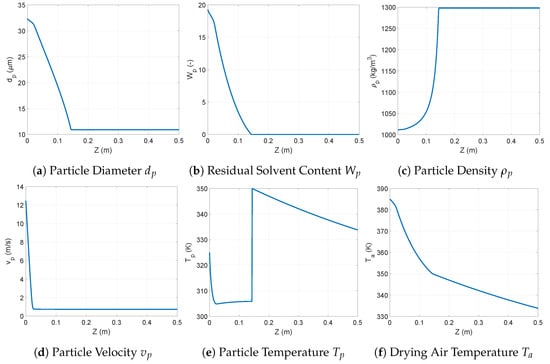 A typical spray drying profile obtained through the solution of the above model is depicted in Figure 2. The profiles observed for all variables illustrate that most of the changes occur in the first part of the drying chamber (i.e., ); this is before the equilibrium humidity is reached. After this point, most of the variables display a steady value. Only the temperatures continue to change due to the heat transfer through the exterior wall of the drying chamber. In this part, the temperature of the gas and of the particle are equal. In the section before the equilibrium point, the droplet/particle velocity determines two distinctive phases. At the very beginning, when the droplet velocity is significantly higher than that of the air (i.e., ), the conditions for mass transfer are favored by the turbulence around the droplets, and therefore, a high evaporation rate of the solvent can be observed. This causes the temperature of the droplet to drop because energy is consumed for evaporation faster than it is transferred from the hot air. The rate of change in droplet size and humidity is also distinctive in this section. Once the droplets have reached terminal velocity, the rate of evaporation is controlled by the energy transferred from the hot air to the droplet, and so the temperature stabilizes around a given value. In this section, the particle size and humidity continue to decrease. This phase ends when the particle has reached the equilibrium humidity. On the one hand, this stops the evaporation, reaching the final particle size, humidity, and density. The temperature, on the other hand, rises very quickly to reach equilibrium with the air temperature.