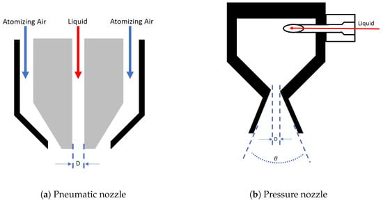 The model was evaluated considering two different spray nozzle configurations: (i) a pneumatic nozzle and (ii) a pressure nozzle. These two configurations were considered to evaluate the impact that the parameters influencing the droplet formation had on the properties of the particulate product. It was also intended to determine if a specific nozzle provided more robustness against any process variability. In a pneumatic nozzle, the gas at high velocity (around sonic) disperses the liquid into droplets. Although many different configurations are available within pneumatic nozzles, a nozzle with parallel flow was considered in this study (Figure 3a). In such nozzles, the droplet size is mainly determined by: (i) the nozzle dimensions, (ii) the liquid properties, (iii) the gas velocity, and (iv) the ratio between gas and liquid flows (ALR). An empirical estimate of the droplet size using these properties is given by Equation (40) [].