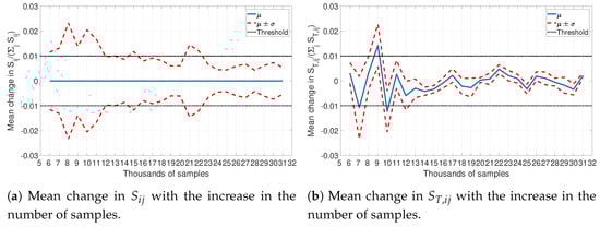 As analytical calculation of sensitivity indices is almost impossible for complex models, so an approximation based on pseudorandom sampling was used to get a good estimate. Traditionally, sampling-based methods assume that a large sample size (>10,000 samples) is enough to guarantee a valid solution. However, how many samples are enough is a difficult question to answer a priori. In this study, an approach with an iterative increase in the number of samples was used to determine the sample size. Starting from 5000 samples, the sample size was increased by 1000 samples at every iteration. A stopping criterion was defined based on the relative change of the normalized first order and total sensitivity indices. Figure 4 shows the evolution of the mean () and the standard deviation () of the change in normalized sensitivity indices (first order, ; and total ) with the increasing number of samples. The number of samples was considered large enough when the the standard deviation in the relative change was less than .