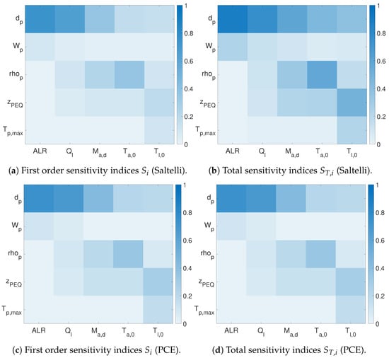 The PCE approach is a meta-modeling approach used to reduce the number of function evaluations. Figure 5 shows the results for the absolute sensitivity indices of the spray dryer operating with the pneumatic nozzle. The two heat maps at the top correspond to the sensitivity indices approximated using Saltelli’s method, and those at the bottom were approximated using PCE. Table 2 presents the input ranking based on the total sensitivity indices.