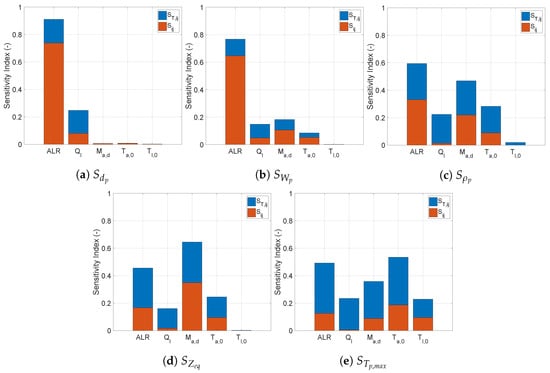 In Figure 7, the scatter plots illustrate the solutions for and , from which samples were taken to perform the sensitivity calculations. The blue dots correspond to a product that has reached its drying equilibrium, while red dots correspond to non-equilibrium. It can be noticed that most of the variation occurred at non-equilibrium conditions. It can also be seen that the ALR determined whether equilibrium was reached, and equilibrium was reached only at high ALR. The low spread in the particle size data showed that the particle size was mostly dominated by the ALR. With the increase in the ALR, the spread of the final particle size reduced, and the possible solutions tended to concentrate close to the equilibrium solution. This is the result of the small droplet size obtained from the pneumatic nozzle at high ALR. Since the droplet size was already very close to the equilibrium size of the particle, other conditions in the process did not have a major impact, and the spread of the possible end particle size was very narrow. Differently, in the case of the residual solvent , its large spread of solutions indicated that other inputs remained influential at any value of ALR. For high ALR, the final humidity of the particle at a non-equilibrium condition would depend also on the number of droplets in the chamber; the larger the number of droplets, the more solvent needed to evaporate to reduce their humidity. Thus, for the pneumatic nozzle, the particle size could be tuned solely by the ALR, whereas an accurate control over the residual solvent content required tuning the liquid feed rate as well.
