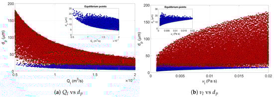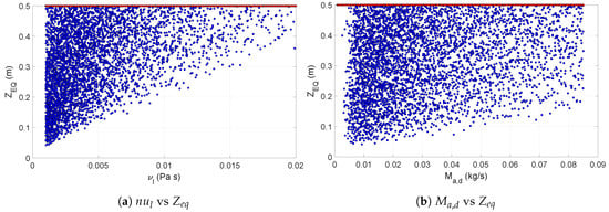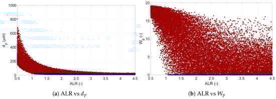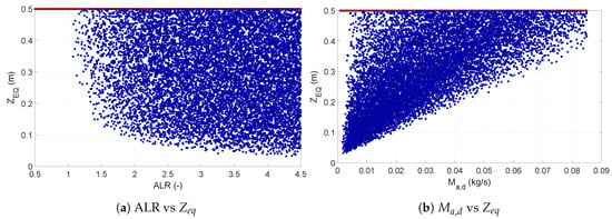For the second group of outputs (, , and ), the ALR was not the sole significant input. The contributions of other inputs varied with every output, but a similarity could be observed between the responses of and . As could be expected, the input temperature played a greater role in the determining the maximum particle temperature. The liquid feed temperature was relevant only for . Figure 8 presents the scatter plots of the length required to reach equilibrium with respect to and . The scatter plots confirmed that ALR had a significant influence on the point at which the equilibrium was reached. For ALR below one, all solutions were in the non-equilibrium region. Once this threshold value of ALR was crossed, the scatter suggested that the point at which the equilibrium was reached was determined by more factors than just the ALR. The scatter plot for the relation between and showed that an increase in the amount of drying air tended to move the equilibrium point towards the bottom of the dryer.