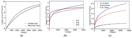 Integral of the D under different experimental conditions. (a) Coals of different ranks; (b) Different equilibrium pressures; (c) Different particle sizes.