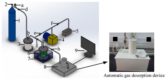 Gas desorption experiment system. (1) High pressure CH4 cylinder (99.9% purity); (2) pressure reducing valve; (3) reference tank; (4) vacuum pump; (5) vacuum gauge; (6) coal sample tank; (7) constant temperature water bath; (8) automatic gas desorption instrument; (9) data collection system; (a–c) pressure gauge; (d–h) valve.