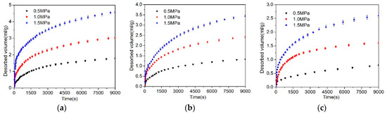 Figure 5 shows the data of gas desorption for the different particle sizes and equilibrium pressures. The desorbed gas volume increased with time for the different particle sizes and pressures. However, the desorption rate decreased with time. At 9000 s, the 0.25–0.5 mm coal samples under 1.5 MPa exhibited the largest desorbed gas volume (4.61 mL/g), while the 1.0–1.25 mm coal samples under 0.5 MPa showed the minimum desorbed gas volume (i.e., 0.78 mL/g), accounting for 47.8% and 29.6% of the desorbed gas volume under 0.5 and 1.0 MPa, respectively. Under the same pressure, taking 0.5 MPa as an example, the desorbed gas volume of 1.0–1.25 mm coal samples accounted for 43.4% and 59.1% of the desorbed gas volume of 0.25–0.5 mm and 0.5–1.0 mm coal samples, respectively. In addition, Figure 5 shows that the desorbed gas volume negatively correlates with the particle size under the same pressure. However, with the same particle size, the pressure positively correlates with the desorbed gas volume because the gas concentration gradient increases with the equilibrium pressure. Furthermore, the desorbed gas volume was affected by both the particle size and pressure.