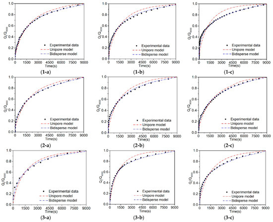 In this experiment, the final desorption amount was not measured as it would take a long time. As all the unipore, bidisperse and UDD models contain an infinite series, they were fitted using the Levenberg−Marquardt algorithm based on the iterative process [21]. However, if Equations (2), (5) and (35) were directly used to fit the diffusivity, the parameters Dae, Die, De, λ, and Q∞ in the equation should be changed to adapt to the experimental data, leading to excessive parameterization and causing deviation. To eliminate this effect, the final desorption volume Q∞ was replaced by the total desorption volume in 9000 s. Hence, the unipore model can be transformed as follows [22]: