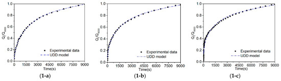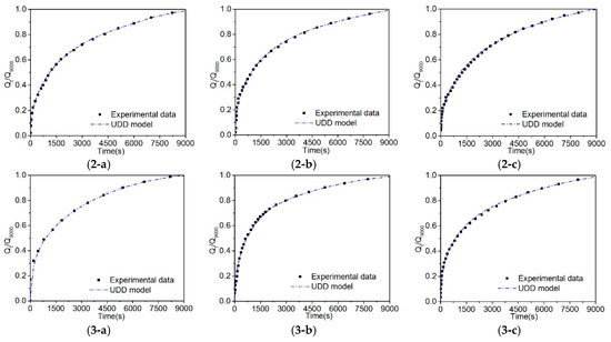 Fitting results of the unsteady dynamic diffusion (UDD) model. (1-a) particle size: 0.25–0.5 mm, gas pressure: 0.5 MPa; (1-b) particle size: 0.25–0.5 mm, gas pressure: 1.0 MPa; (1-c) particle size: 0.25–0.5 mm, gas pressure: 1.5 MPa; (2-a) particle size: 0.5–1.0 mm, gas pressure: 0.5 MPa; (2-b) particle size: 0.5–1.0 mm, gas pressure: 1.0 MPa; (2-c)particle size: 0.5–1.0 mm, gas pressure: 1.5 MPa; (3-a) particle size: 1.0–1.25 mm, gas pressure: 0.5 MPa; (3-b) particle size:1.0–1.25 mm, gas pressure: 1.0 MPa; (3-c)particle size: 1.0–1.25 mm, gas pressure: 1.5 MPa.