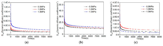 Figure 7 and Table 5 show the fitting results and constants of the UDD model. The fitting results of the UDD model were excellent, with the R2 values of gas diffusivity of all samples well above 0.999, which is better than the unipore and bidisperse models. Table 5 shows that the values of A and k increase with the decrease of the particle size, whereas the β values have no significant dependence on the particle size, and the values of k are <1. The order of magnitude of the A value ranged 10−4–10−5, which is roughly similar to the initial diffusion coefficient reported previously [23,24], and the value of A is 1–3 orders of magnitude higher than β. Figure 8 shows the diffusion characteristics of the coal samples with three different particle sizes under three different pressures. The diffusivity of gas decreases rapidly in the early stage, and the diffusion coefficient decreases gradually to a flat level in the later stage. Under the same pressure, the particle size negatively correlated with the diffusion coefficient. For 0.25–0.5 mm and 0.5–1.0 mm coal samples, the dynamic diffusion coefficient positively correlated with pressure, while for 1.0–1.25 mm coal samples, increased first and then decreased with the increase of pressure.