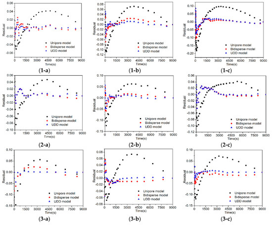 Residual comparing the unipore, bidisperse, and UDD models. (1-a) particle size: 0.25–0.5 mm, gas pressure: 0.5 MPa; (1-b) particle size: 0.25–0.5 mm, gas pressure: 1.0 MPa; (1-c) particle size: 0.25–0.5 mm, gas pressure: 1.5 MPa; (2-a) particle size: 0.5–1.0 mm, gas pressure: 0.5MPa; (2-b) particle size: 0.5–1.0 mm, gas pressure: 1.0 MPa; (2-c) particle size: 0.5–1.0 mm, gas pressure: 1.5 MPa; (3-a) particle size: 1.0–1.25 mm, gas pressure: 0.5 MPa; (3-b) particle size:1.0–1.25 mm, gas pressure: 1.0MPa; (3-c) particle size: 1.0–1.25 mm, gas pressure: 1.5 MPa.
