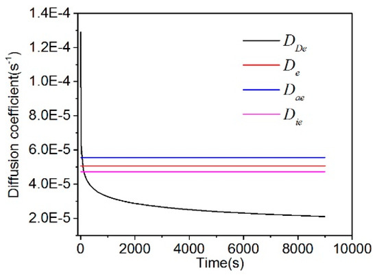 Based on the calculation results of Equation (34) and Table 5, the initial effective coefficient in the UDD model was approximately Aktk−1 as β < 1. Combining the initial conditions and calculation results, k was between 0 and 1, so there should be a time when Aktk−1 = 1 in the first second of the initial diffusion. Hence, A in the UDD model could be considered as the initial diffusion coefficient of the dynamic diffusion model.