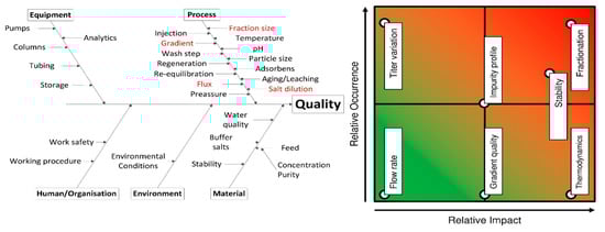 Before starting, it is important to define the quality target product profile and critical quality attributes. After that, a risk assessment is required. This might be done, for example, by aid of Ishikawa diagrams and failure mode and effect analysis, as presented in Figure 2 [7,17]. Although this step is not mandatory for process simulation, but part of quality-by-design, conclusions drawn here directly define the modelling task, the parameters that need to be covered with the model, and the level of detail needed. If, for example, a specific flow regime within a unit (e.g., a stirred tank) is crucial, computational fluid dynamics is needed rather than an equilibrium stage model.