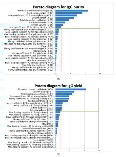 The input for DoEs are the model and process parameters with a reasonable range for the given problem. These arise from prior knowledge (e.g., early process development), literature or, at best, previous model-based process development. To compare the sensitivity results with the expectation it is best to consider the expected influence of each parameter on the target values. The target values need to be defined as well. In this case study, only purity, as a classical quality attribute, and yield, as a common performance parameter, are used. In most cases, there will be more than two target values. Within a quality-by-design approach, other quality attributes should be added, like monomer-to-dimer ratio, host cell protein concentration, and so on. For process development, extension to more performance attributes like productivity or buffer consumption might be interesting.